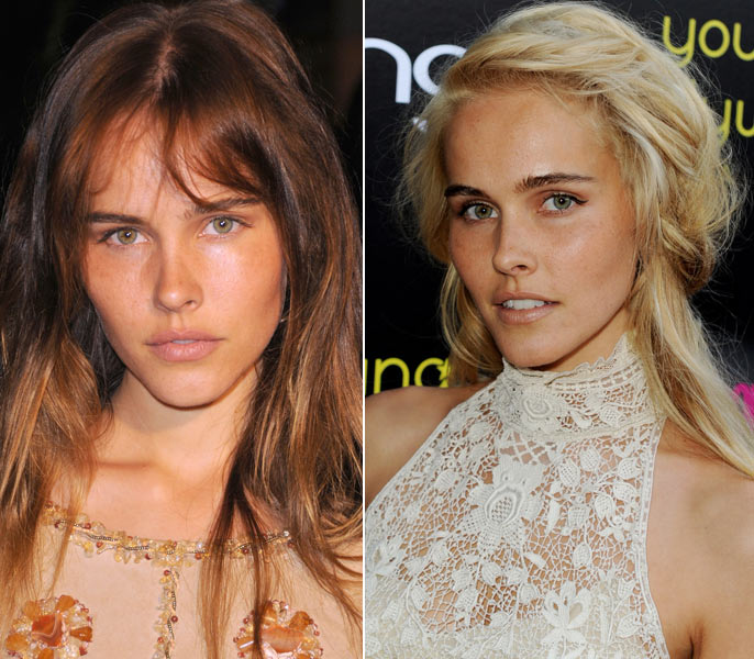 A atriz australiana usou franja desfiada e cabelos castanhos, com mechas californianas, em fevereiro. Em maio deste ano, ela tingiu de loiro e dispensou a franja. Qual penteado você mais gostou?