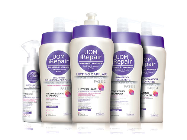 O sistema de redução de volume Hair Lifting UOM Nano Repair da Tanagra promete reduzir o volume total ou parcial dos fios.