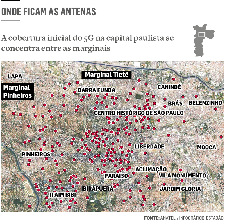 Segundo a Anatel, a maior concentração de antenas está no Centro Histórico, na região da Avenida Paulista e no Itaim Bibi. Já os bairros da Aclimação, da Mooca e do Brás, por exemplo, terão cobertura menor no início do processo.
