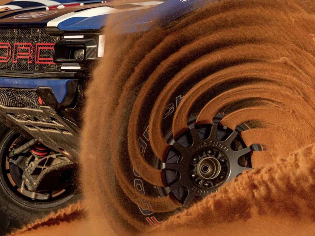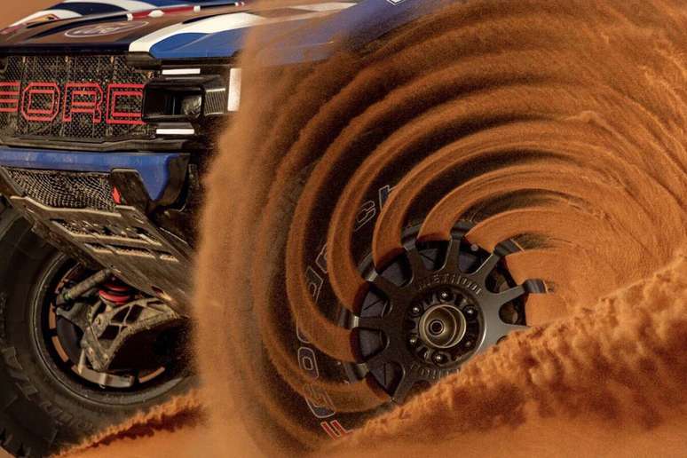 Na foto, a roda de um Ford Raptor T1+ gera uma espiral de areia enquanto escava a duna. O efeito dessa espiral é muito chamativo, e a Ford aproveitou a imagem para falar do papel que as rodas têm em um carro de competição como esse e em um ambiente tão complicado quanto o deserto. Tratam-se de rodas forjadas assinadas pela Method Race Wheels, e o que a Ford diz é que elas foram projetadas para oferecer o equilíbrio perfeito entre durabilidade e leveza.