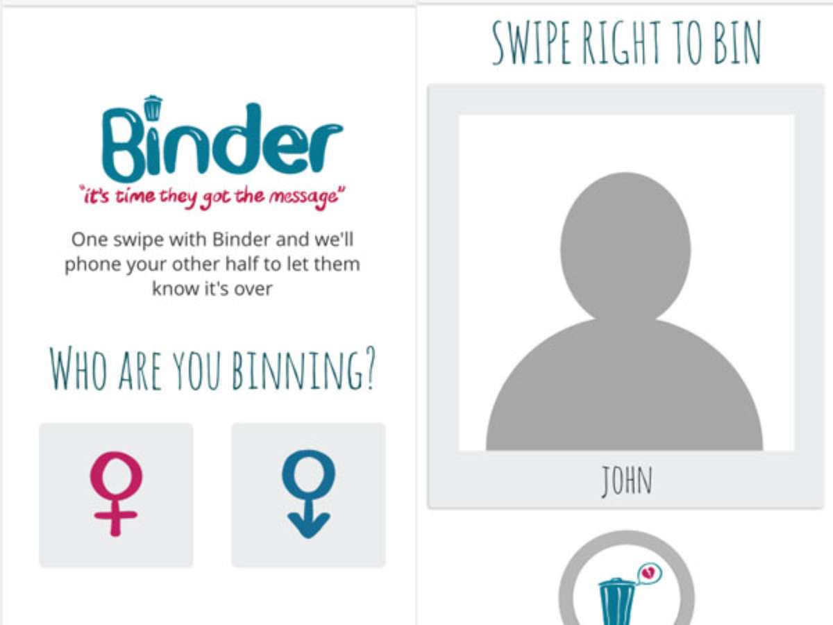 Apelidado de "anti-Tinder", o aplicativo auxilia o usuário que deseja por fim a um relacionamento. O nome é um trocadilho e faz referência a "bin", palavra que em inglês significa "lata de lixo". "A internet tornou super fácil encontrar alguém especial. Binder torna se livrar delas tão fácil quanto. Com apenas um golpe nós tiramos a dor de sua outra metade", diz a descrição.