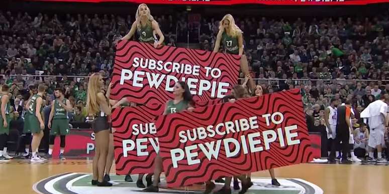 Líderes de torcida do time de basquete BC Zalgaris pedem para que as pessoas se inscrevam no PewDiePie. (Fonte: PewDiePie/Reprodução)