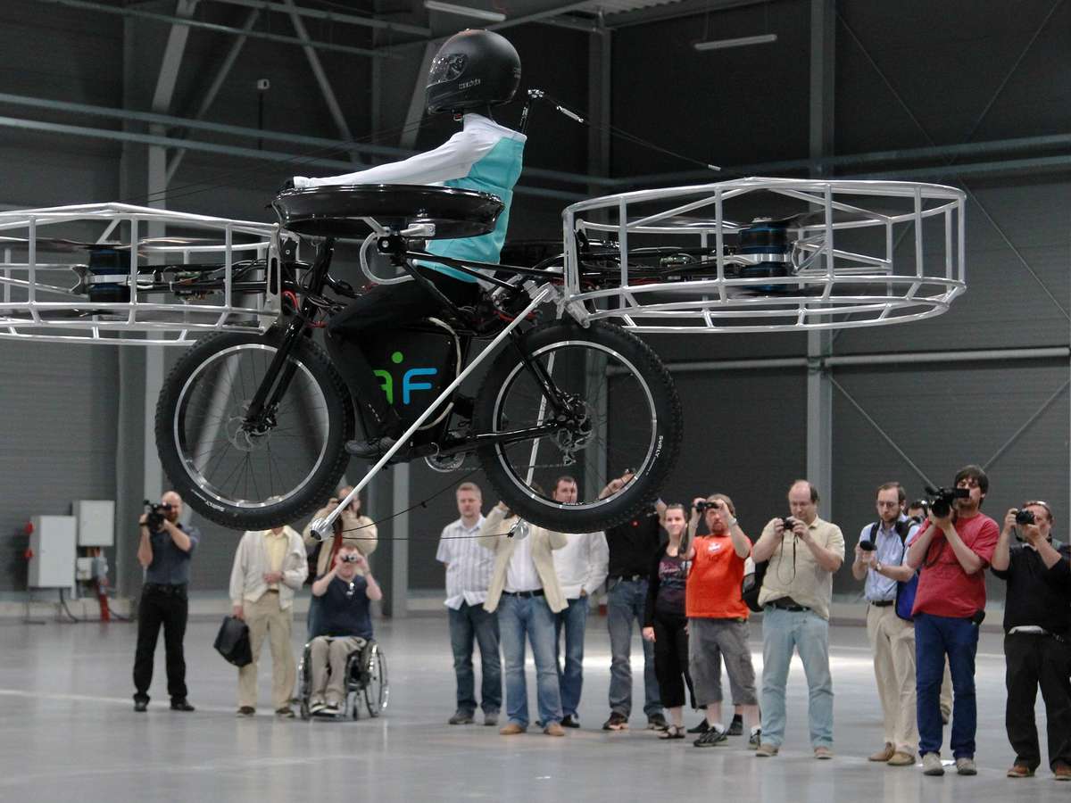 Engenheiro controla remotamente a bicicleta, que no teste voa carregando um manequim