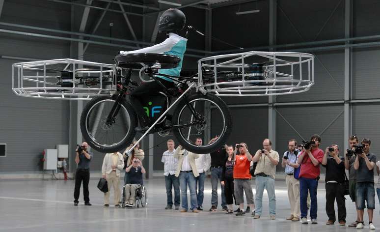 Jornalistas assistem a uma demonstração de uma bicicleta voadora em uma feira em Praga. O veículo, criado por designers checos se mantém no ar usando seis hélices de propulsão elétrica