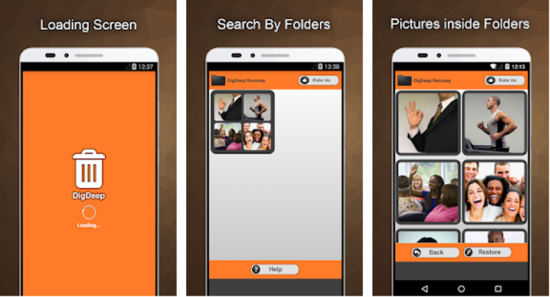 O DigDeep é um dos aplicativos para recuperar fotos apagadas mais populares da Play Store. A ferramenta faz uma busca entre os arquivos deletados, tanto na memória interna do smartphone quanto no cartão de memória, carregando as imagens encontradas durante a varredura em diferentes pastas.