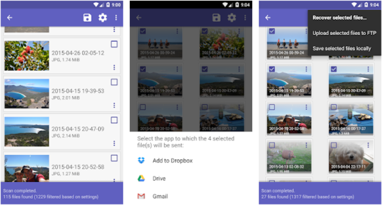 O DiskDigger também é capaz de recuperar fotos excluídas do cartão de memória ou do próprio smartphone. Após a finalização da varredura, o aplicativo permite que o usuário envie as imagens encontradas para o Google Drive, Dropbox, e-mail ou para uma nova pasta no aparelho.