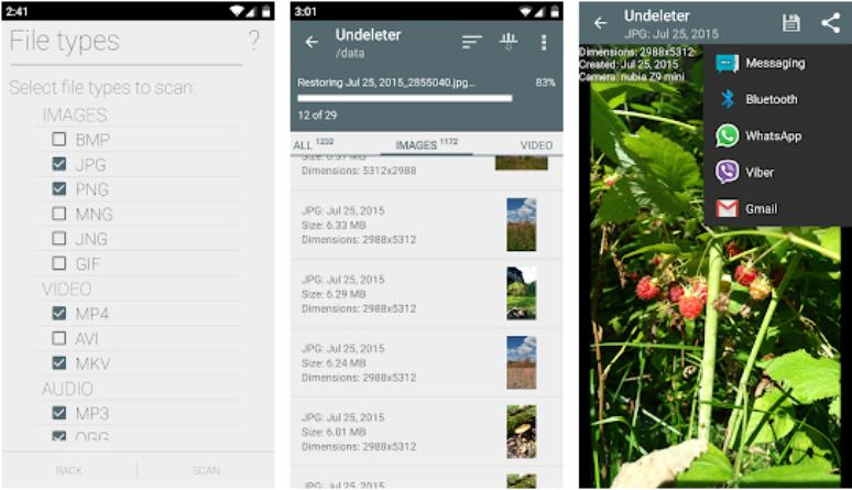 Para quem não só apagou fotos como também deletou outros arquivos importantes, o Undeleter pode ser uma boa pedida. Além de recuperar imagens apagadas, o aplicativo permite que o usuário tenha acesso a outros tipos de conteúdos excluídos. A varredura do Undeleter é capaz de recuperar os seguintes tipos de arquivos: BMP, JPEG/JPG, PNG, MNG, JNG, GIF, MP4, AVI, MKV, MP3, OGG, OGM, WAV, FLAC, AMR, MP4A, PDF, SXD, SXI, SXC, SXW, ODT, ODG, ODS, ODP, DOCX, XLSX, PPTX, ZIP, JAR, APK, EPUB.