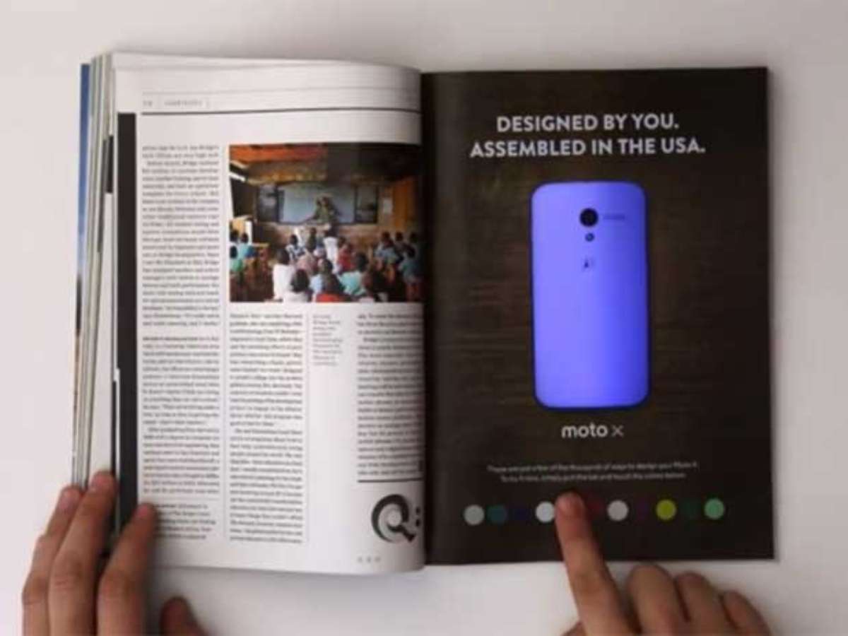 A Motorola publicou um anúncio na edição de janeiro da revista de tecnologia americana Wired que permitirá que os leitores interajam com a página, mudando a cor do Moto X que aparece na publicação. O anúncio foi projetado para enfatizar as possibilidades de customização do aparelho.