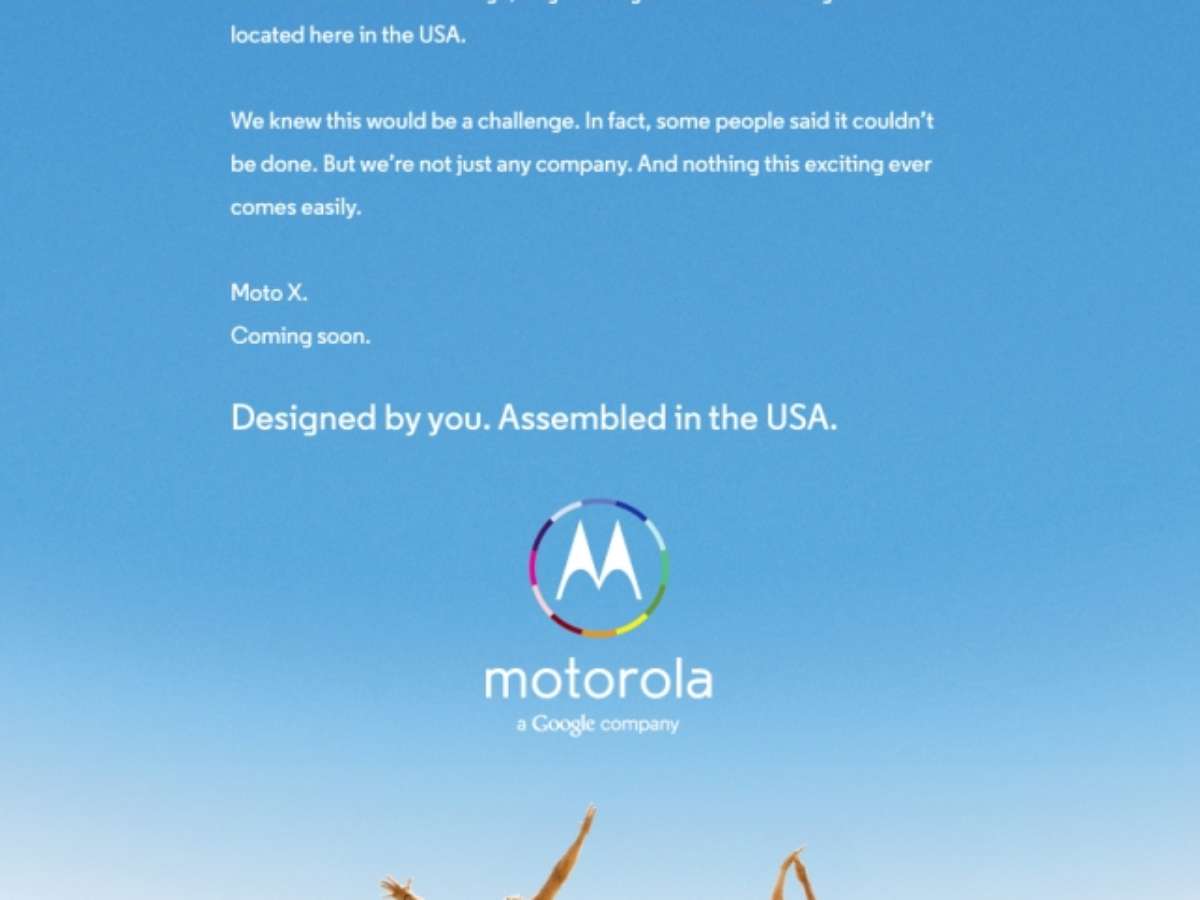 A Motorola publicará em jornais americanos nesta quarta-feira o primeiro anúncio do seu próximo smartphone, o Moto X, o primeiro lançado pela empresa como uma "companhia Google". Dois anos após ser comprada pela gigante da internet por US$ 12,5 bilhões, o anúncio da Motorola destaca que o smartphone será fabricado nos EUA e poderá ser customizado.