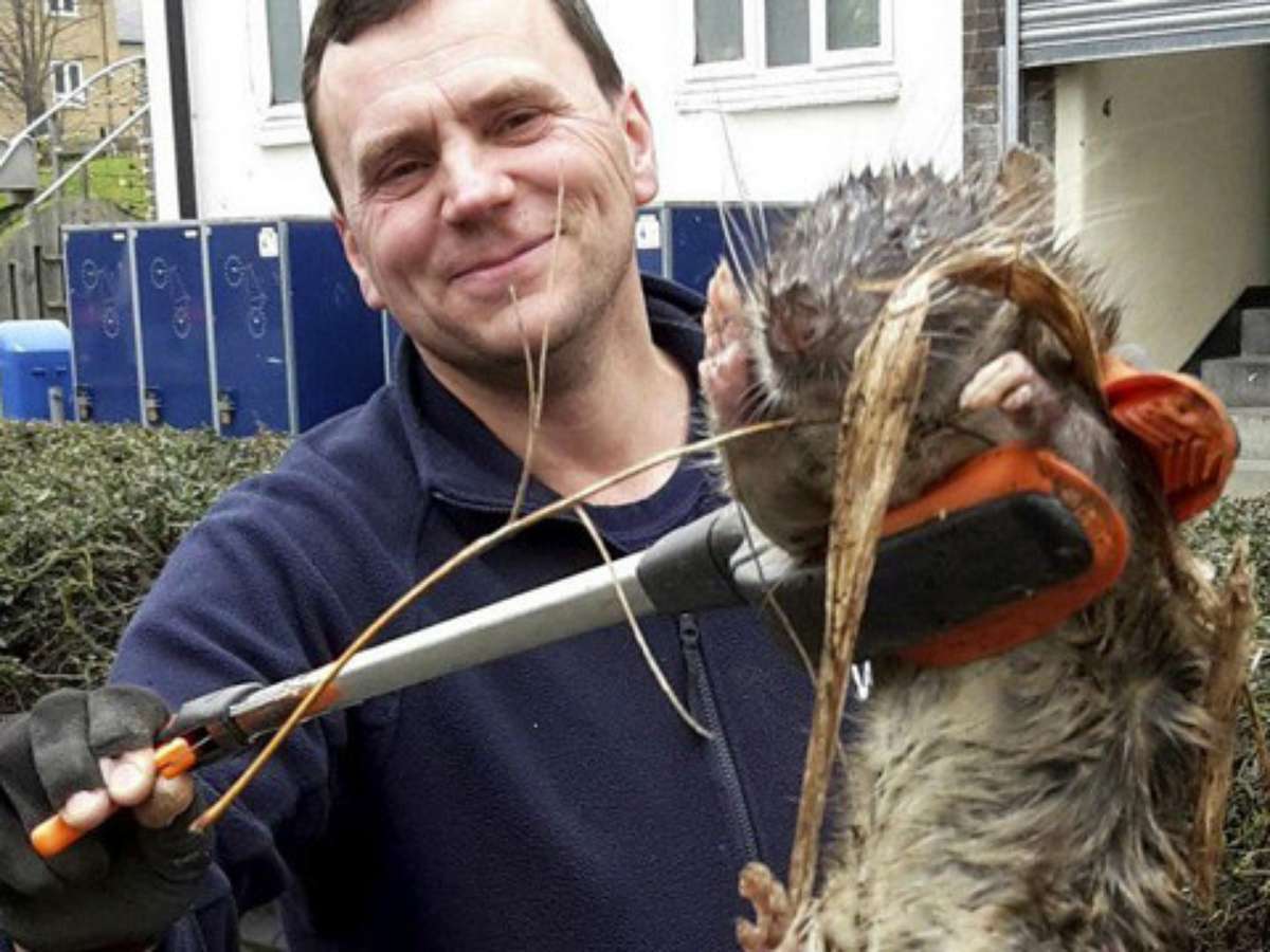 Na imagem, um eletricista aparece mostrando o roedor após encontrá-lo morto atrás de um arbusto no bairro de Hackney, em Londres.