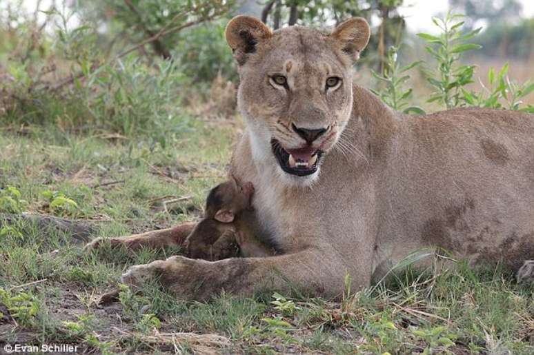 O fotógrafo americano Evan Schiller registrou o momento em que uma leoa acolhe o filhote de um babuíno que havia acabado de matar. O fato curioso aconteceu em um parque em Botswana, país da África.