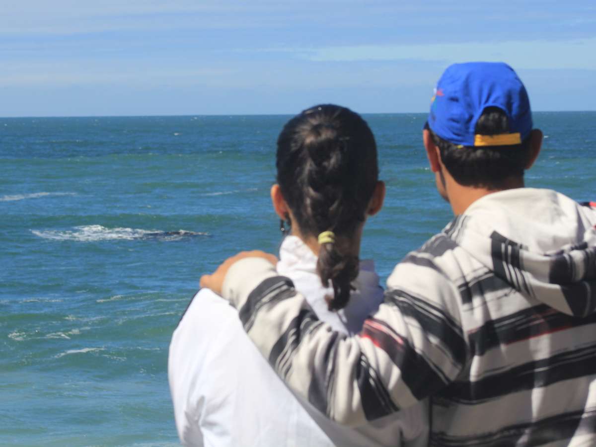 Uma baleia com seu filhote chegou a se aproximar muito de um costão na região do Morro das Pedras