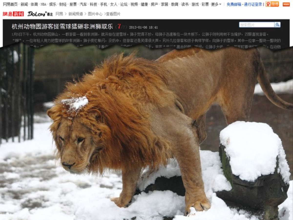 As imagens mostram um leão sendo atingido por bolas de neve, que seriam lançadas por um grupo de jovens chineses, posicionados nas proximidades do recinto do animal. O material foi publicado no Twitter e gerou uma onda de protestos, no entanto, não é possível comprovar a autenticidade das fotos.