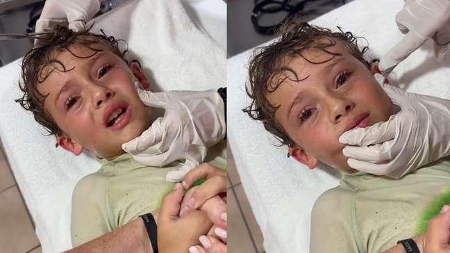 Assustado, o menino chega a perguntar se ficaria cego. A mãe ri e diz que não.