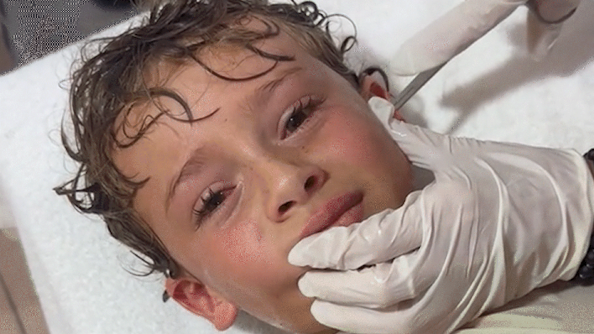 Na publicação, o menino aparece chorando de mãos dadas com a mãe enquanto está deitado em uma maca. Um médico, então, começa a mexer dentro de seu ouvido em busca do que estava incomodando o garoto.