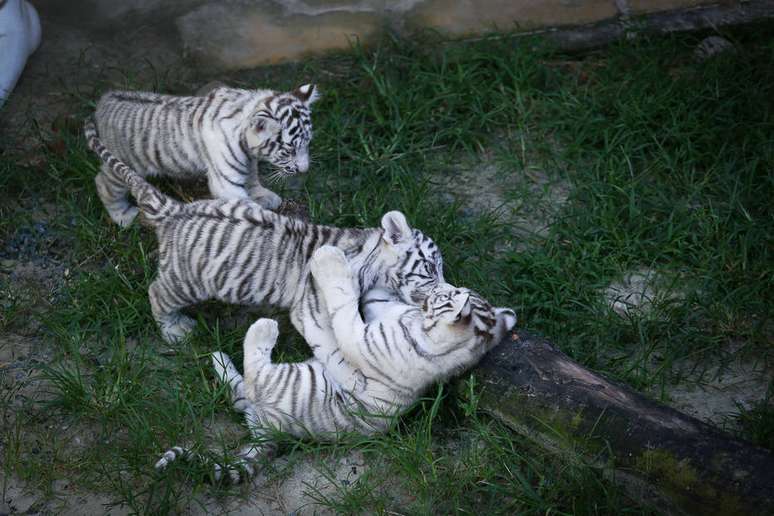 Radesh, Indra e Indira, três filhotinhos de tigre branco, foram mostrados ao público nesta sexta-feira, 11, após 40 dias de quarentena necessários após terem nascido em um zoológico em Santa Catarina.