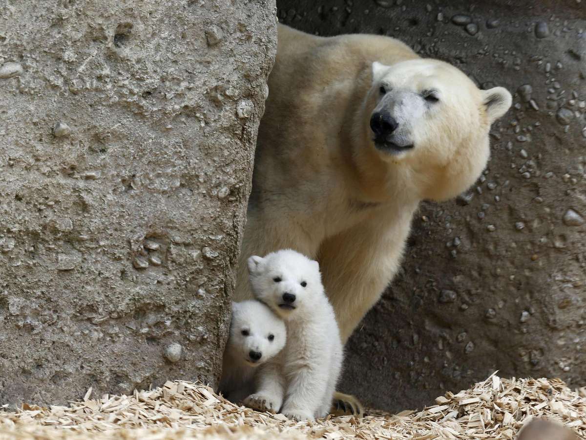 Filhotes gêmeos de urso polar ficam com a mãe 'Giovanna' no espaço reservado a eles no Tierpark Hellabrunn, em Munique
