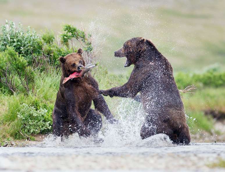 Quando o peixe sobe o rio para largar e fertilizar as ovas, os predadores toleram a presença uns dos outros