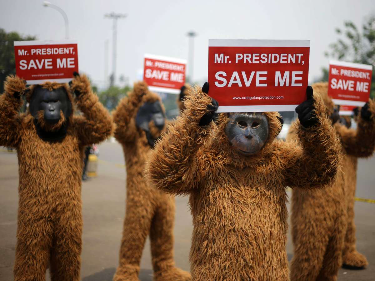 Ativistas vestidos de orangotango fazem protesto diante do palácio presidencial da Indonésia, na capital Jacarta, para pedir que o presidente Susilo Bambang Yudhoyono tome medidas imediatas para salvar a espécie da extinção.