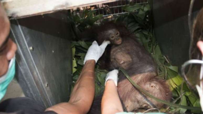 Uma fêmea de orangotango-de-bornéu e seu filhote foram resgatados em estado de choque após serem atacados por moradores de um vilarejo na Indonésia. Os dois animais, que fugiam de um incêndio florestal, estavam desnutridos e abraçados quando foram salvos pela ONG britânica International Animal Rescue (IAR).