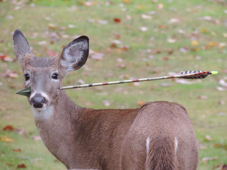 Biólogos encontraram um veado que teve a cabeça atingida pela flecha de um caçador no Estado americano de Nova Jersey. O jovem animal teve tranquilizantes aplicados para acalmá-lo e possibilitar a remoção do artefato. O alerta foi dado por uma moradora de Rockaway, que recebeu repetidas visitas do veado em seu quintal