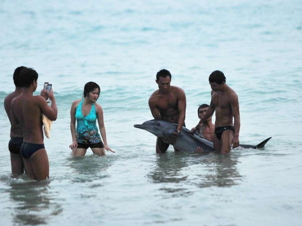 Nas imagens divulgadas na internet, é possível observar um grupo de turistas levantando o golfinho, que encalhou em uma praia da ilha meridional de Hainan.