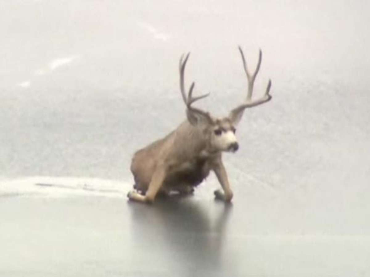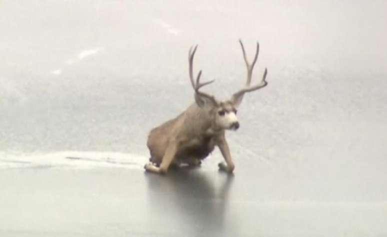 Um veado-mula com dificuldade para se equilibrar sobre um lago congelado foi resgatado com sucesso na cidade de Golden, no Estado americano do Colorado.