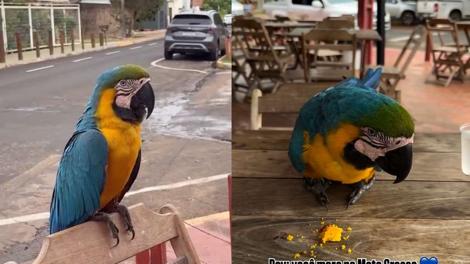 Arara-canindé surpreende casal ao participar de café da manhã em padaria de Rondonópolis (MT)