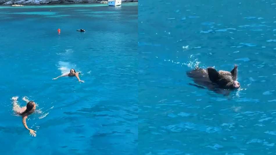 A situação inusitada aconteceu na última quinta-feira, 31, e foi compartilhada por Aleks Jevtic. As jovens estavam se banhando nas águas cristalinas de uma praia remota na Grécia quando um javali surgiu atrás delas. Inicialmente, as banhistas acharam que a cena era apenas divertida. Mas alguém num barco gritou: "Vocês precisam sair, não é seguro!". Então, as turistas nadaram rapidamente e se refugiaram na embarcação, enquanto o suíno nadava na direção delas. "Ser perseguida por um porco no meio da Grécia é bem diferente", escreveu ela na legenda do vídeo que já teve mais de 4,5 milhões de visualizações. Reprodução/@aleks_jevtic/TikTok