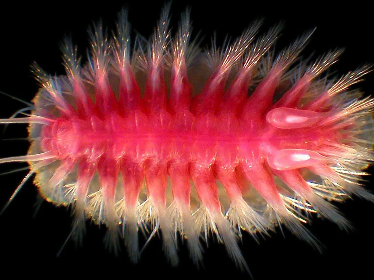 O Osedax mucofloris, ou "flor de muco que come ossos", é um verme poliqueta que foi descoberto pela primeira vez em 2005, na carcaça de uma baleia. Esses vermes injetam ácido no osso. "É como se colocassem o próprio intestino dentro do osso e o absorvessem diretamente — algo bastante estranho", diz Glover, do Museu de História Natural de Londres, no Reino Unido.