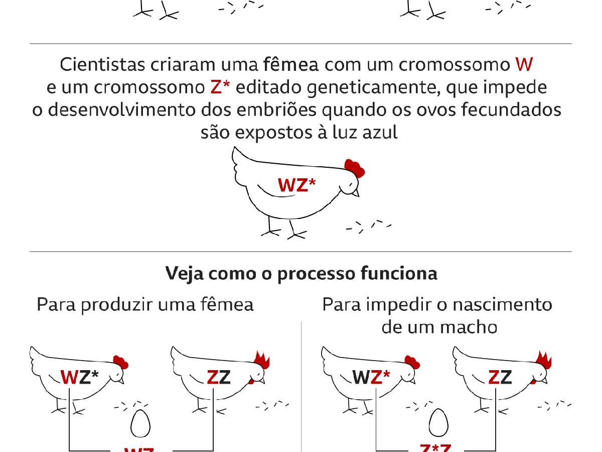 Os cientistas editaram geneticamente o DNA das galinhas Golda que podem interromper o desenvolvimento de qualquer embrião macho nos ovos que elas botam. O DNA é ativado quando os ovos são expostos à luz azul por várias horas.