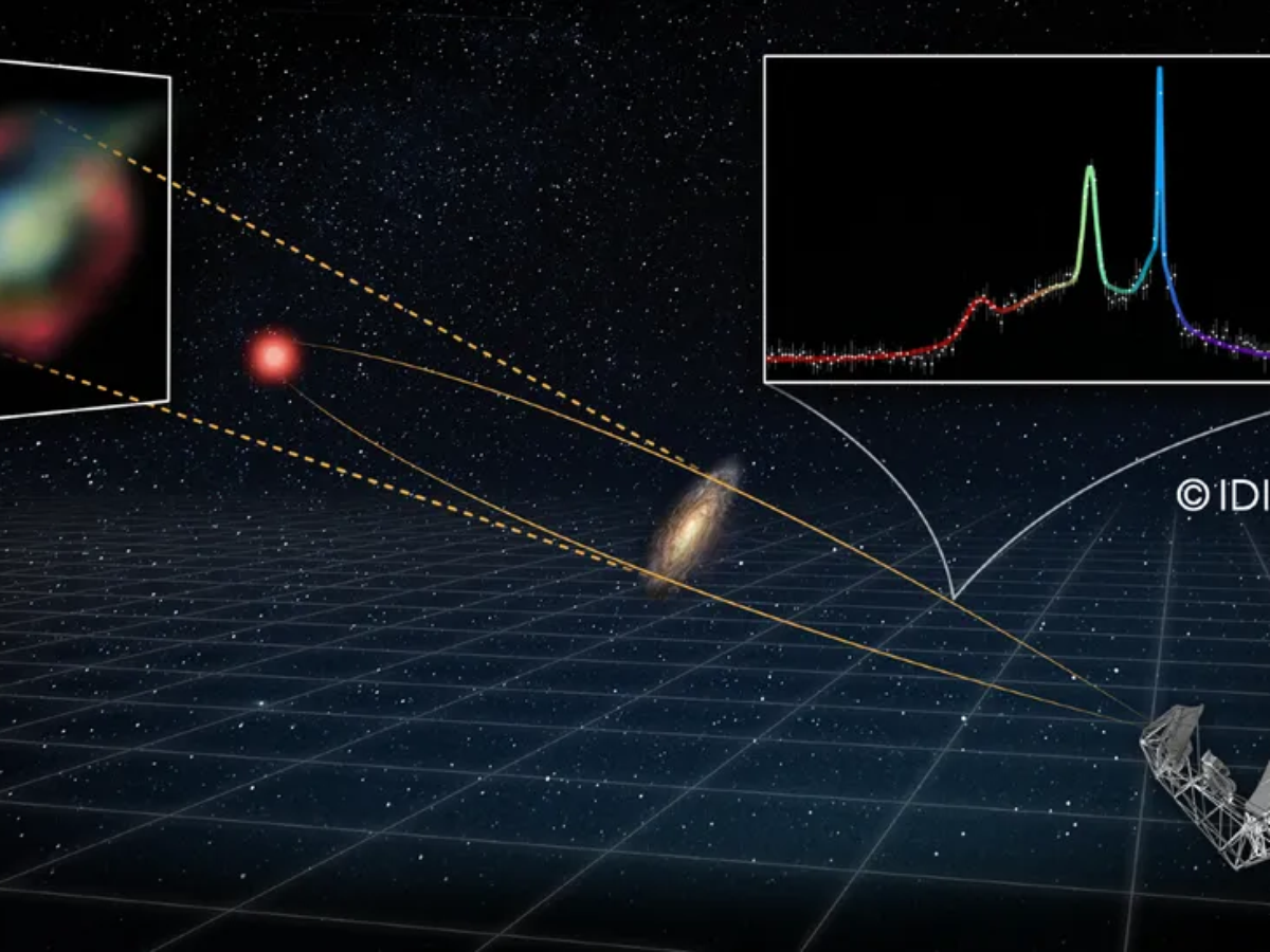 A detecção só foi possível graças a um fenômeno previsto pela teoria da relatividade de Albert Einstein, chamado lente gravitacional. Nesse caso, a gravidade de uma galáxia situada entre a Terra e a fonte do sinal atua como uma lente natural, curvando o espaço-tempo e ampliando a radiação emitida por objetos muito distantes.