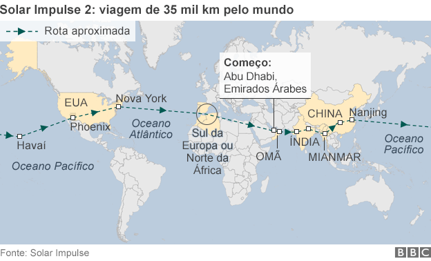 De lá, o Solar Impulse irá para Nova York e cruzará o oceano Atlântico para dar início a seu retorno a Abu Dhabi.