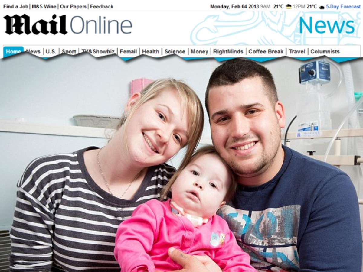 Os médicos perceberam que havia algo de errado com Maddison, que nasceu em outubro de 2011, quando ela começou a fazer alguns ruídos em vez de chorar após o parto. A suspeita se agravou quando a pequena recebeu sua primeira mamadeira e ficou azul ao tentar ingerir o líquido, necessitando ser ressuscitada. Ela então ficou oito semanas em uma unidade neonatal enquanto a equipe médica tentava entender o que a afetava. Agora, a família se prepara para levar o bebê para casa, depois de aprovada uma intensa rotina de cuidados domésticos.