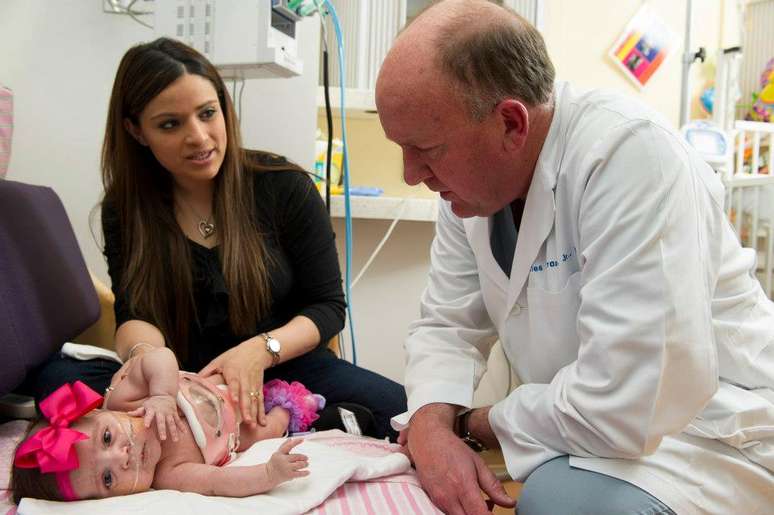 O dr. Charles Fraser, cirurgião-chefe do Texas Children's Hospital, examina a criança enquanto conversa com a mãe. A menina nasceu com uma doença rara chamada ectopia cordis: um terço de seu coração fica para fora do corpo