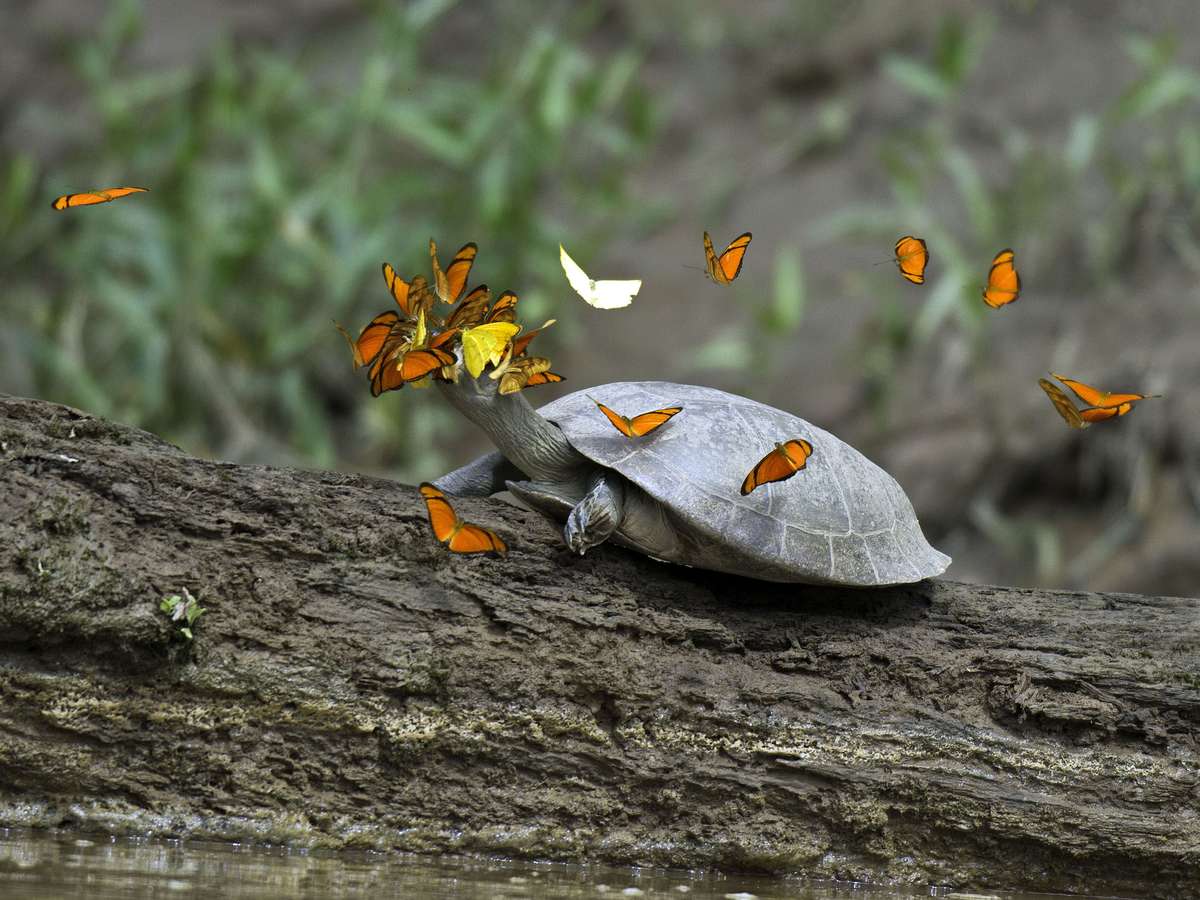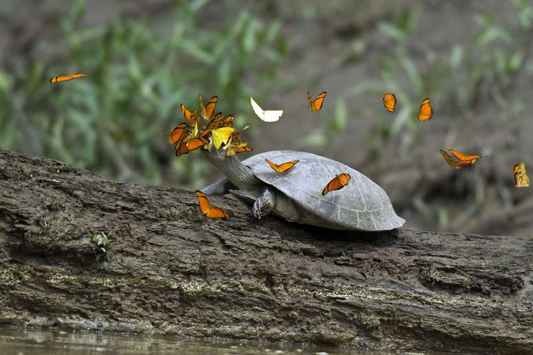 Uma grupo de tartarugas teve suas lágrimas enxugadas por um bando de gentis borboletas no coração da Amazônia. Ainda que possa parecer um simples ato de bondade, os insetos estão na verdade bebendo o líquido salgado, rico em minerais que, acreditam cientistas, ajuda as borboletas a se reproduzirem - e ainda as alimenta