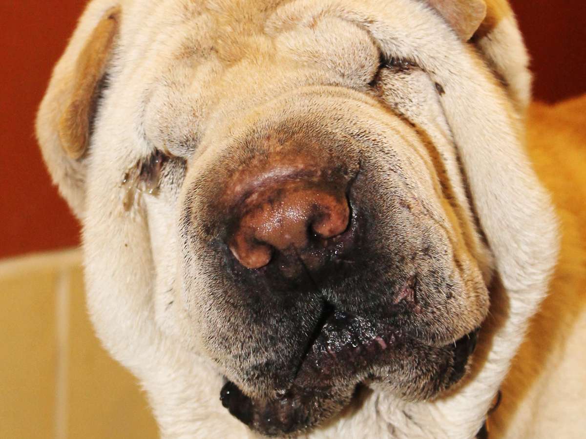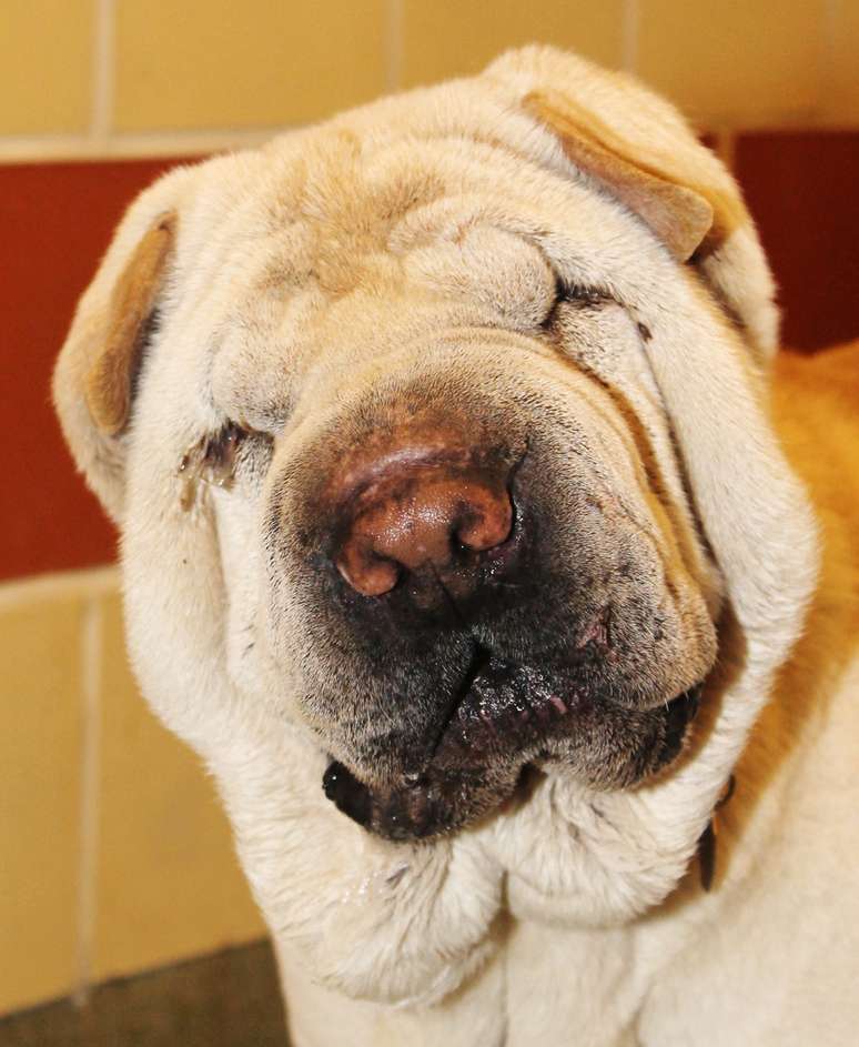 Sesame, um cachorro de dois anos da raça shar-pei, sofria com excesso de dobras na pele do rosto. A pele, enrugada demais, acarretava problemas para o cão: ele mal podia abrir os olhos e era muito suscetível a erupções cutâneas (bolhas na pele). O peso das dobras também fechava o acesso aos ouvidos e fez com que ele desenvolvesse infecções. Esta imagem de 28 de fevereiro mostra o animal antes da cirurgia