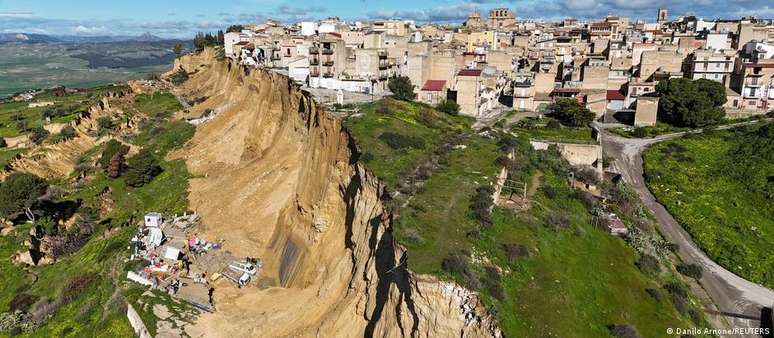 As imagens impressionantes de prédios pendurados precariamente à beira de um precipício em Niscemi circularam por toda a Itália após o desabamento de uma grande área de terra devido aos vários dias de chuvas intensas.