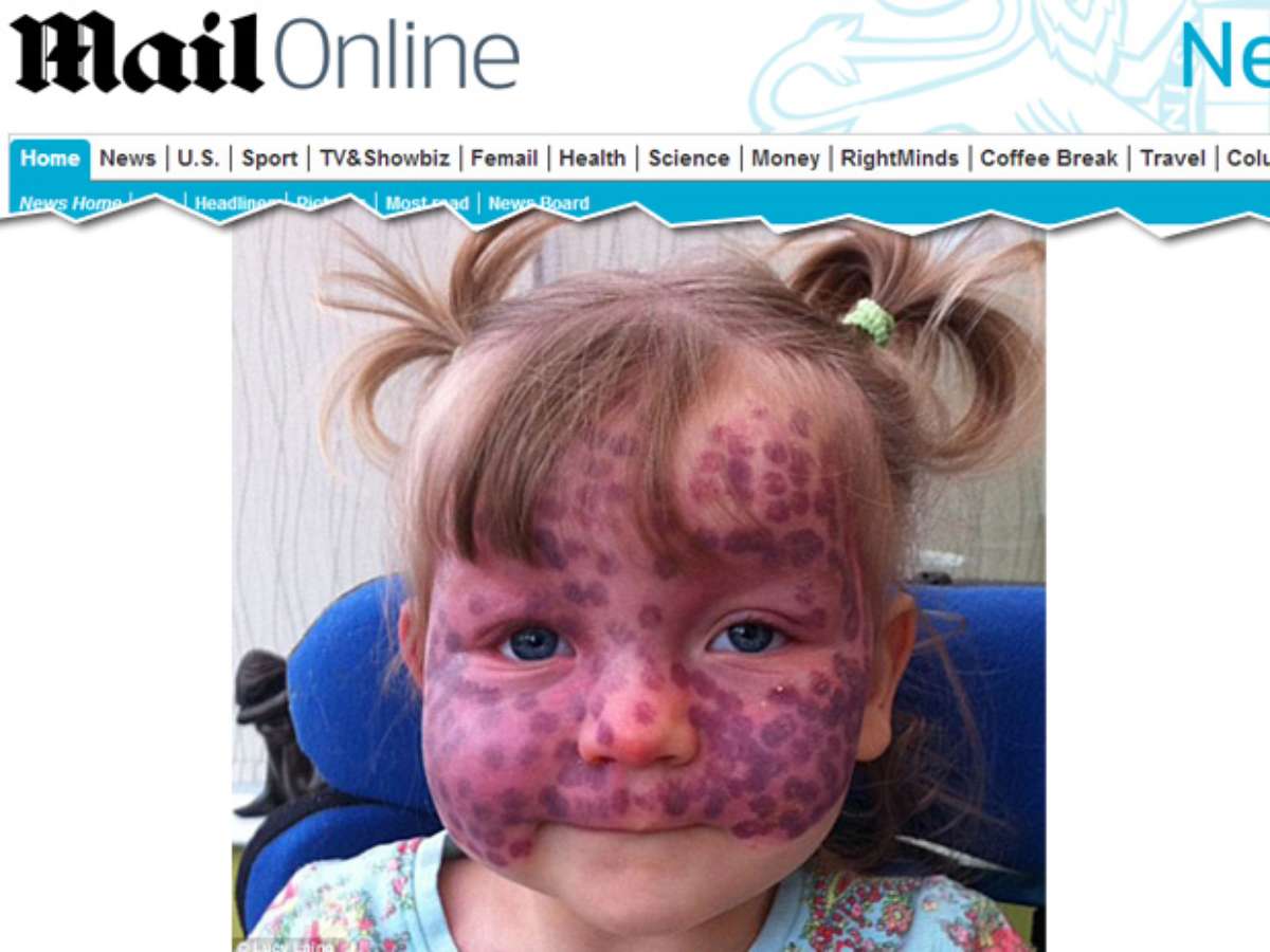 A britânica Matilda Callaghan, 2 anos, precisa fazer tratamento com laser na pele a cada dois meses para diminuir marcas de nascença. Ela nasceu com uma mancha roxa no rosto que os médicos pensaram ser fruto de uma contusão, mas duas semanas depois ela foi diagnosticada com síndrome de Sturge Weber, uma doença rara de pele, que prejudica aprendizagem, causa paralisia, glaucoma e convulsões. As informações são do Daily Mail.
