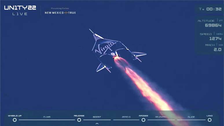 O lançamento do foguete VSS Unity em alta altitude neste domingo marca o 22º vôo de teste da empresa com seu sistema SpaceShipTwo e a quarta missão tripulada que vai além da atmosfera terrestre. É também o primeiro voo a transportar um conjunto completo de viajantes espaciais --dois pilotos e quatro "especialistas", entre eles Branson.