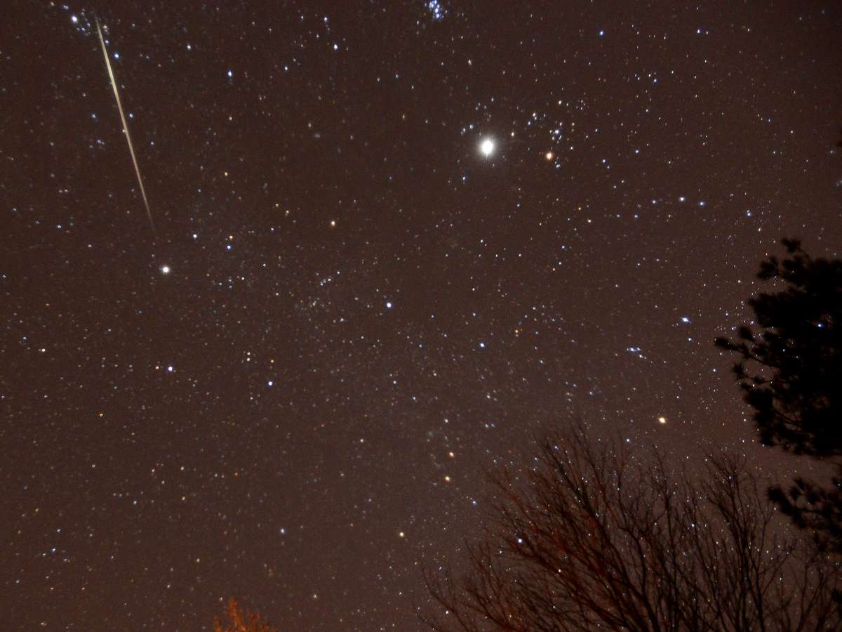 Um meteoro cruza o céu durante a chuva de meteoros anual Geminídeas sobre Springville, Alabama
