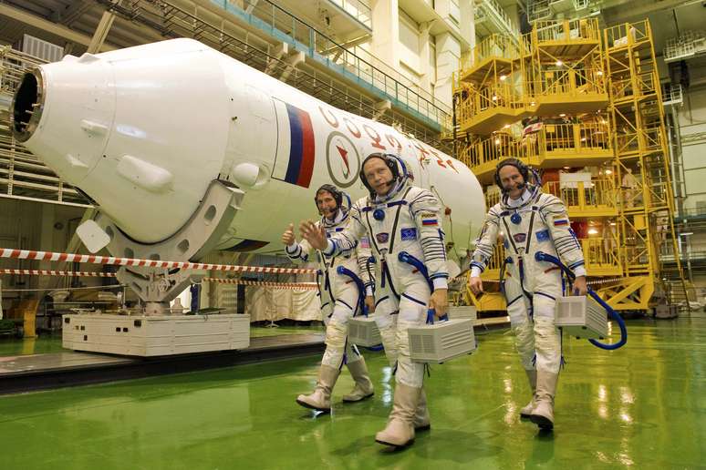 Cosmonautas russos participam de uma sessão de treinamento no cosmódromo de Baikonur. Hopkins, Kotov e Ryazanskiy estão programados para fazerem parte de uma missão para a Estação Espacial Internacional (ISS). O lançamento dos astronautas ao espaço está programado para o dia 26 de setembro, de acordo com a agência espacial russa, Roscosmos