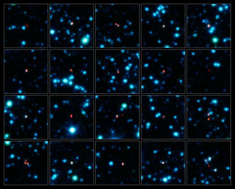 Imagem mostra detalhadamente uma seleção destas galáxias observadas pelo ALMA (em vermelho). As observações ALMA, nos comprimentos de onda do submilímetro, encontram-se sobrepostas a uma imagem infravermelha da região, obtida pela câmara IRAC a bordo do Telescópio Espacial Spitzer (em azul)