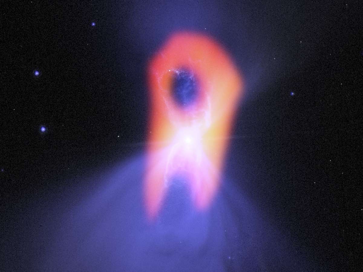A estrutura azul ao fundo da imagem, visível através da luz pelo telescópio espacial Hubble, mostra um formato considerado clássico para esse tipo de estrutura cósmica, com uma região central muito estreita. Através da alta resolução do telescópio Alma no Chile, os astrônomos puderam ver as frias moléculas de gás que revelam uma forma mais alongada da nebulosa, em vermelho na imagem.