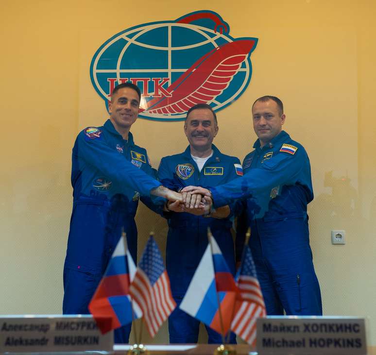 Os membros da Expedição 35 - Chris Cassidy (esq.), Pavel Vinogradov (centro) e Alexander Misurkin (dir.) - são vistos antes de embarcar na nave Soyuz que foi lançada em direção à ISS