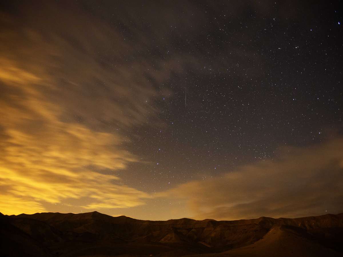 Nesta imagem, a chuva de meteoros Geminídeas é registrada no deserto da Judeia, em Israel. Em condições ideais de observação (com céu limpo e nenhuma poluição, por exemplo), pode-se ver até 120 meteoros por hora. Nas grandes cidades, somente os mais intensos podem ser vistos. O fenômeno anual pode ser observado em todo mundo sempre no mês de dezembro