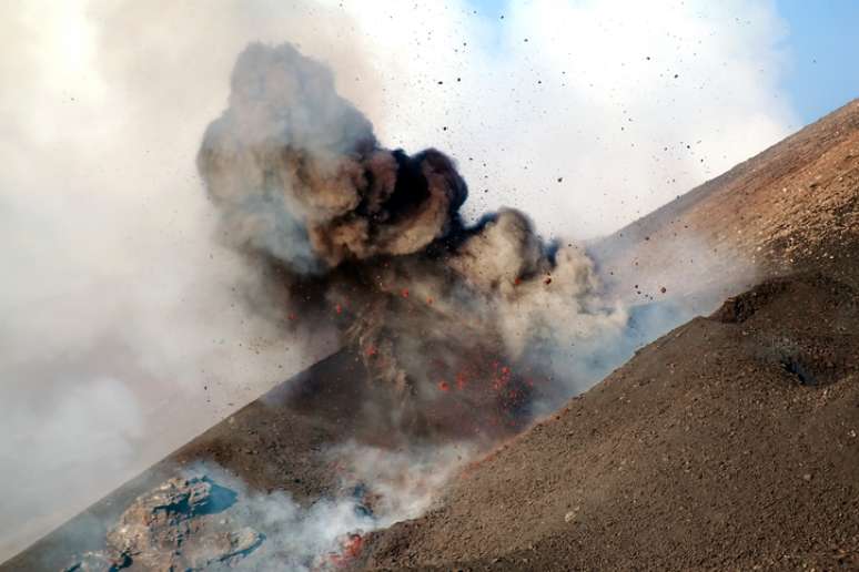 O órgão divulgou imagens nas quais é possível ver as explosões de lava e de cinza em uma cratera da encosta sudeste do vulcão, que chegam a atingir 200 metros de altura.