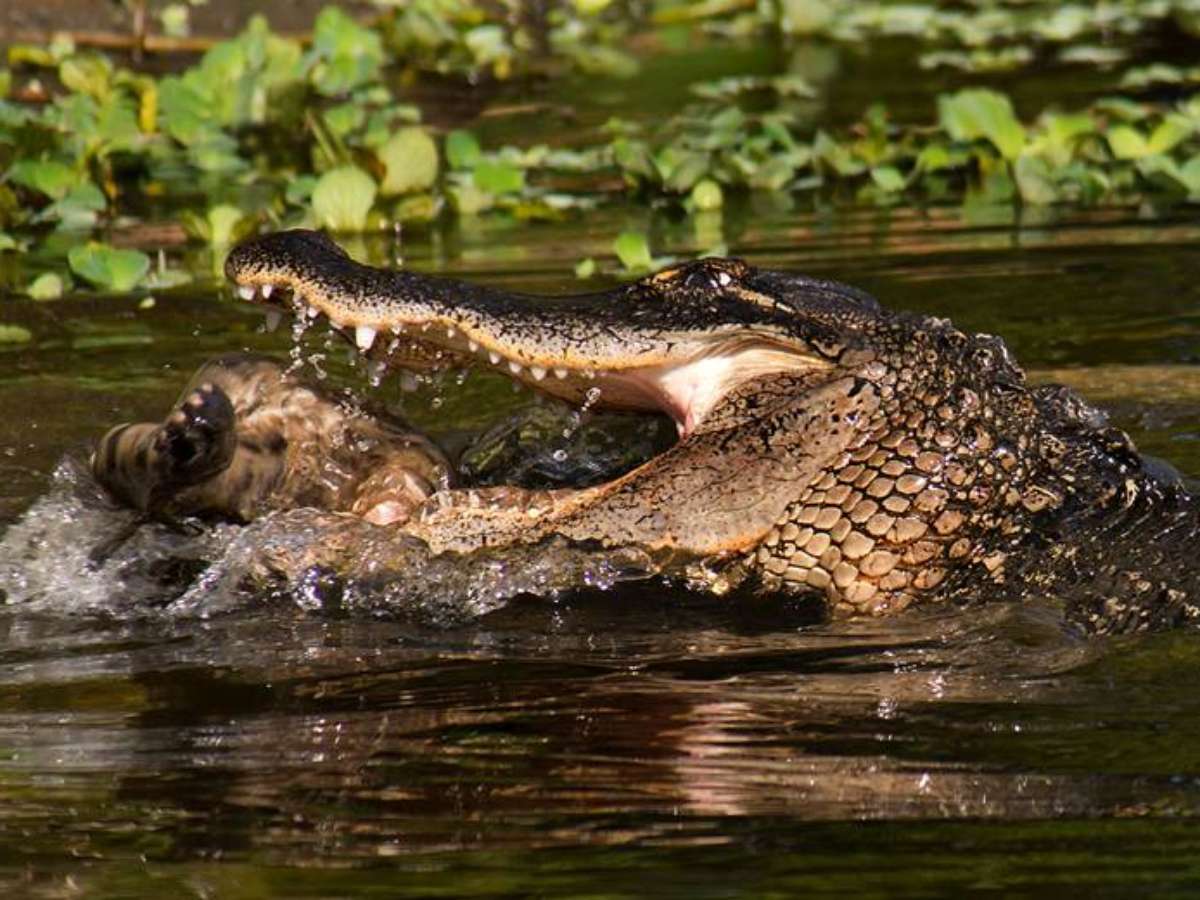 Jamie conta que se surpreendeu ao ver o jacaré sair da água com um lince-pardo (Lynx rufus) inteiro na boca