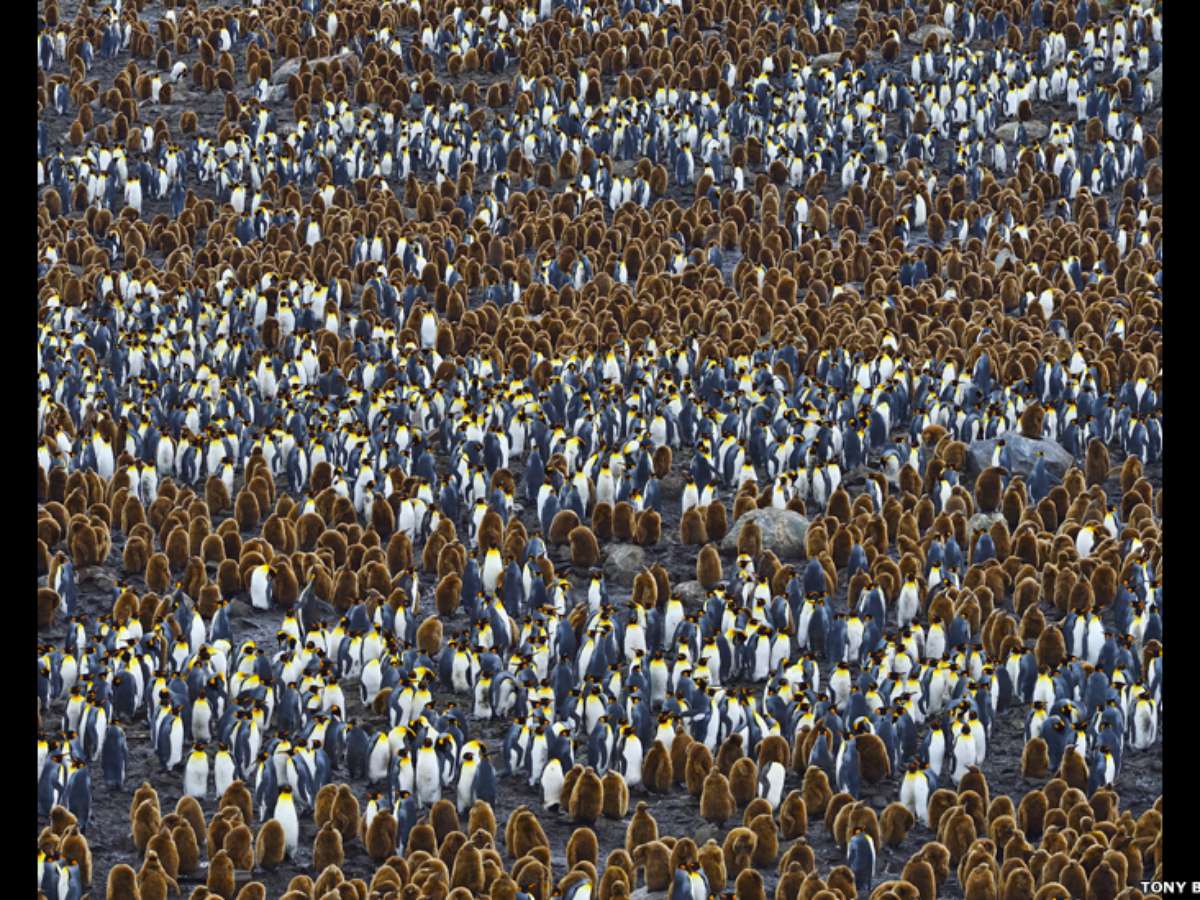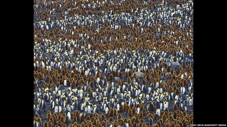 O fotógrafo canadense Tony Beck fez uma série de fotos de pinguins durante uma viagem à Ilha Georgia do Sul, próxima às Malvinas/Falklands. Entre as imagens flagradas está esta formação de pinguins-rei que lembra a letra S