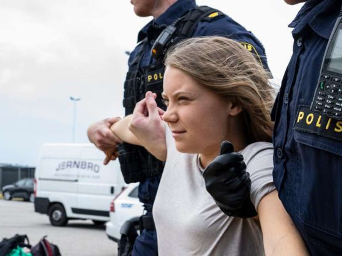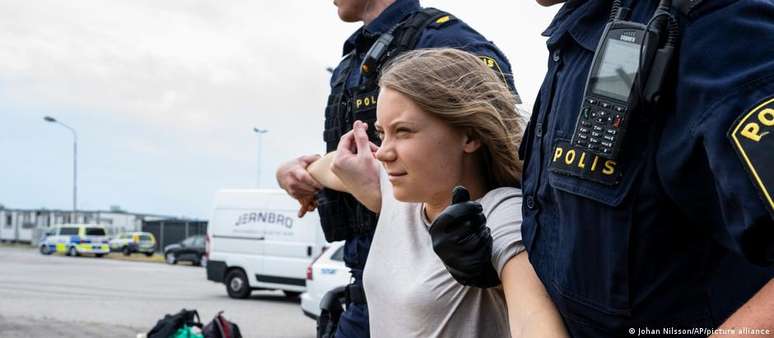 Depois de cerca de uma hora, ela e cinco outros ativistas foram removidos à força do local pelos policiais. Em nota, a polícia confirmou que eles serão notificados por "desobedecer ordens policiais" - a mesma acusação que Thunberg enfrentou no tribunal pela manifestação de junho.